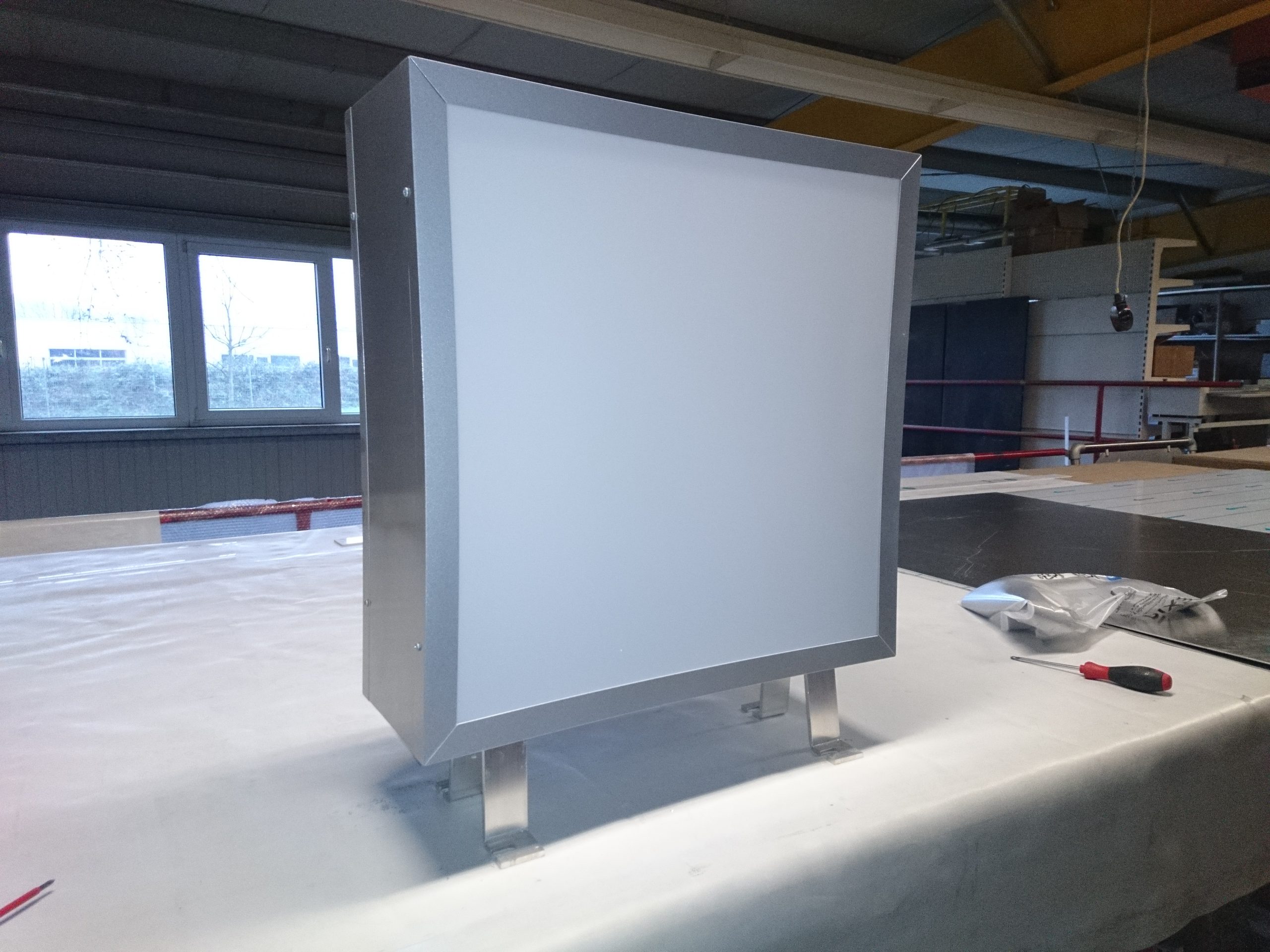 Reliefkörper im Profil 8 sind ähnlich aufgebaut wie im Profil 7. Die Acrlyglas-Frontseiten werden hierbei außen bündig auf bereits gebogene Acrylglas-Zargen aufgeklebt. Die so entstandenen Oberteile werden auf die innen mattweiß (RAL 9016) lackierten Unterteile aus Metall oder aus weißem Kunststoff aufgeschoben und mit ihnen seitlich verschraubt.